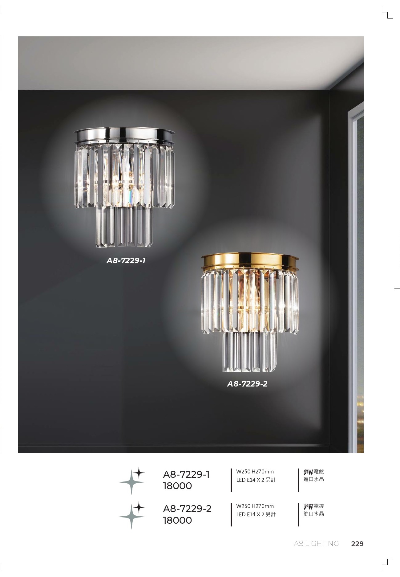A8-7229-2 W250 H270mm LED E14 X 2 另計 鋼材電鍍 進口水晶