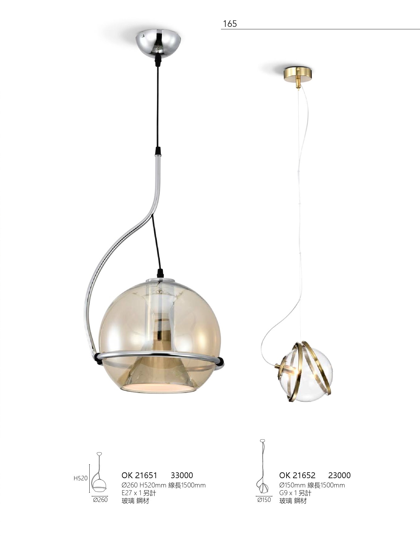 OK 21652 直徑150 線長1500mm G9 x1 另計 玻璃 鋼材